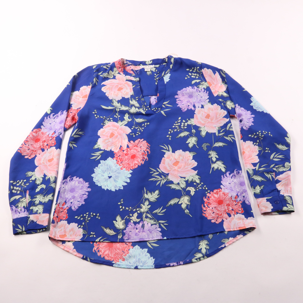 Блузка Amisu синего цвета с крупным цветочным принтом и V-образным вырезом. Подойдёт для офиса и повседневных образов, хорошо смотрится как навыпуск, так и заправленной. Практичный плюс — лёгкая ткань из полиэстера почти не мннётся и быстро сохнет.