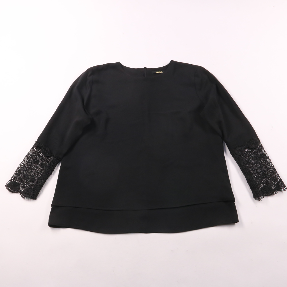 Женская блузка Simia чёрного цвета с кружевной отделкой на рукавах. Подойдёт для офиса и вечерних выходов, хорошо смотрится с юбкой или брюками. Практичный плюс — немнущаяся ткань из полиэстера и аккуратная застёжка-молния сзади.