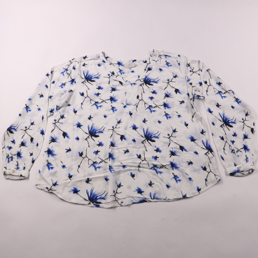 Блузка Kaffe белого цвета с сине-чёрным цветочным принтом и V-образным вырезом. Подойдёт для офиса и повседневных образов с джинсами или юбкой. Лёгкая вискоза хорошо дышит и комфортна в течение дня.