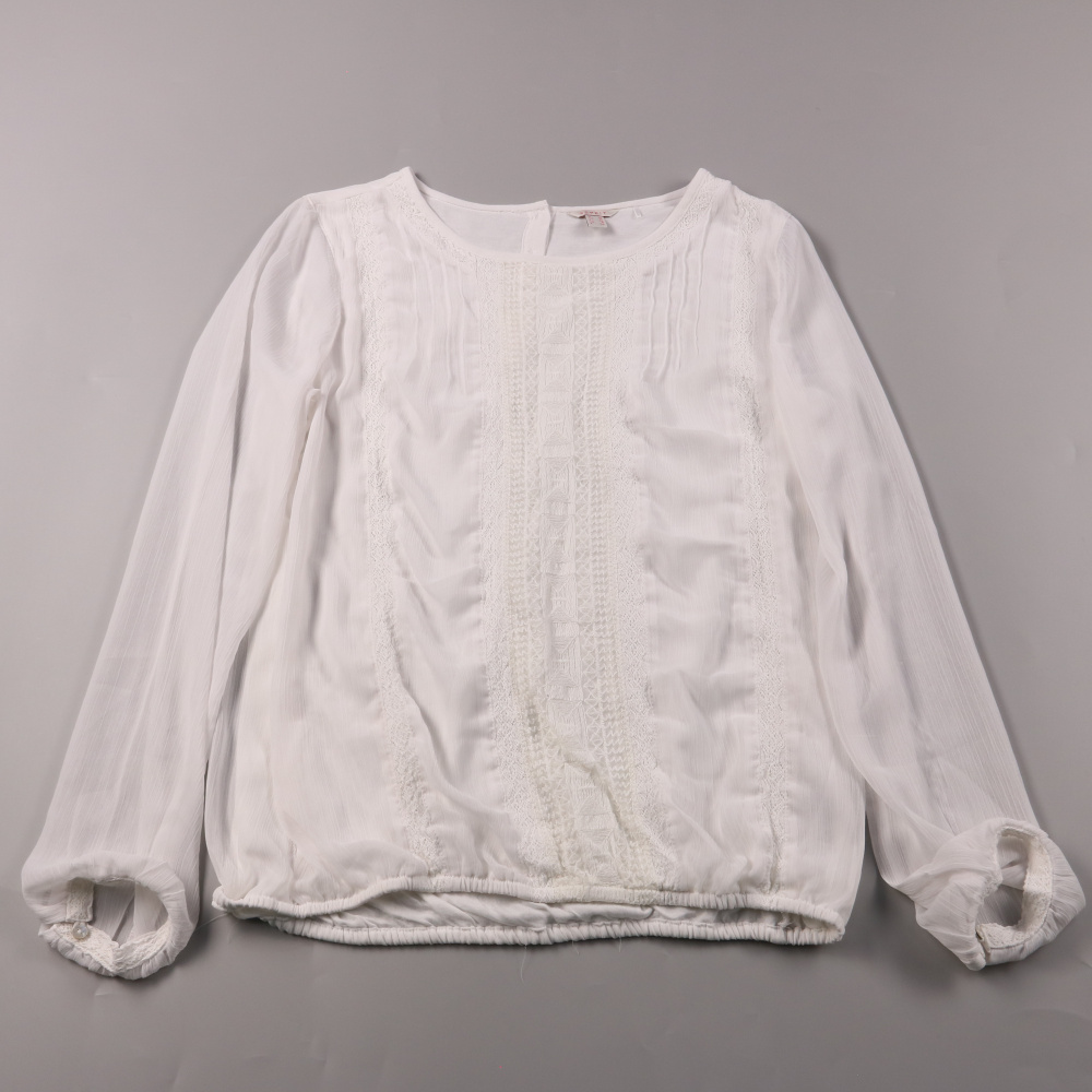 Белая блузка Esprit из лёгкой ткани с кружевной отделкой спереди и длинными полупрозрачными рукавами. Подойдёт для офиса и повседневных образов, хорошо смотрится с джинсами или юбкой. Практичный плюс — тонкий материал быстро сохнет и почти не мнётся.
