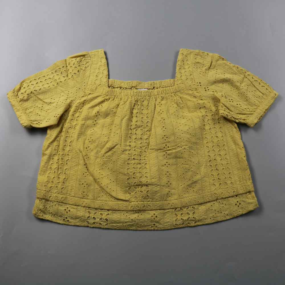 Жёлтая блузка Lalu из ажурной хлопковой ткани с квадратным вырезом и коротким рукавом. Подойдёт для летних прогулок и отпуска, хорошо сочетается с джинсами и юбками. Лёгкий хлопок дышит и комфортен в жару.