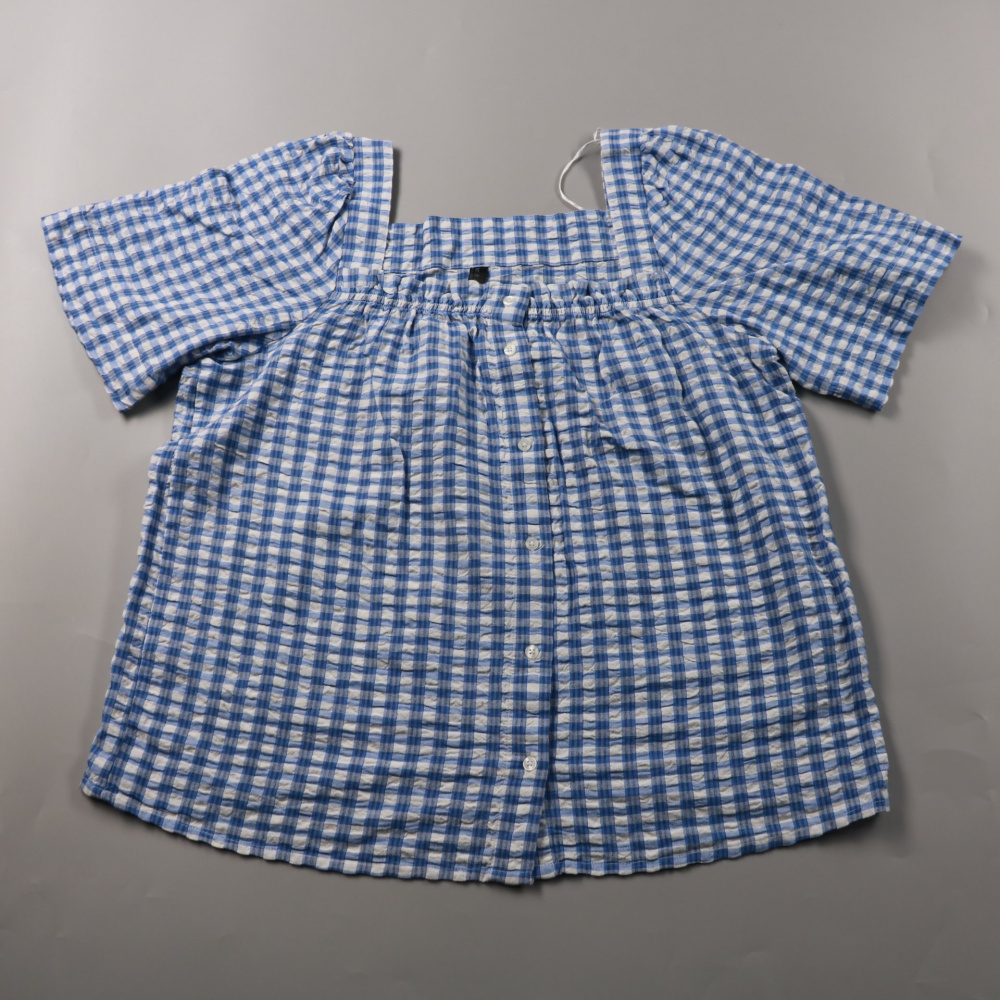 Лёгкая блузка Ed it ed в голубую клетку с открытыми плечами и короткими рукавами. Подойдёт для лета и отпуска, хорошо сочетается с джинсами, шортами и юбками. Ткань с жатой фактурой — не так заметны мелкие заломы и удобно в уходе.