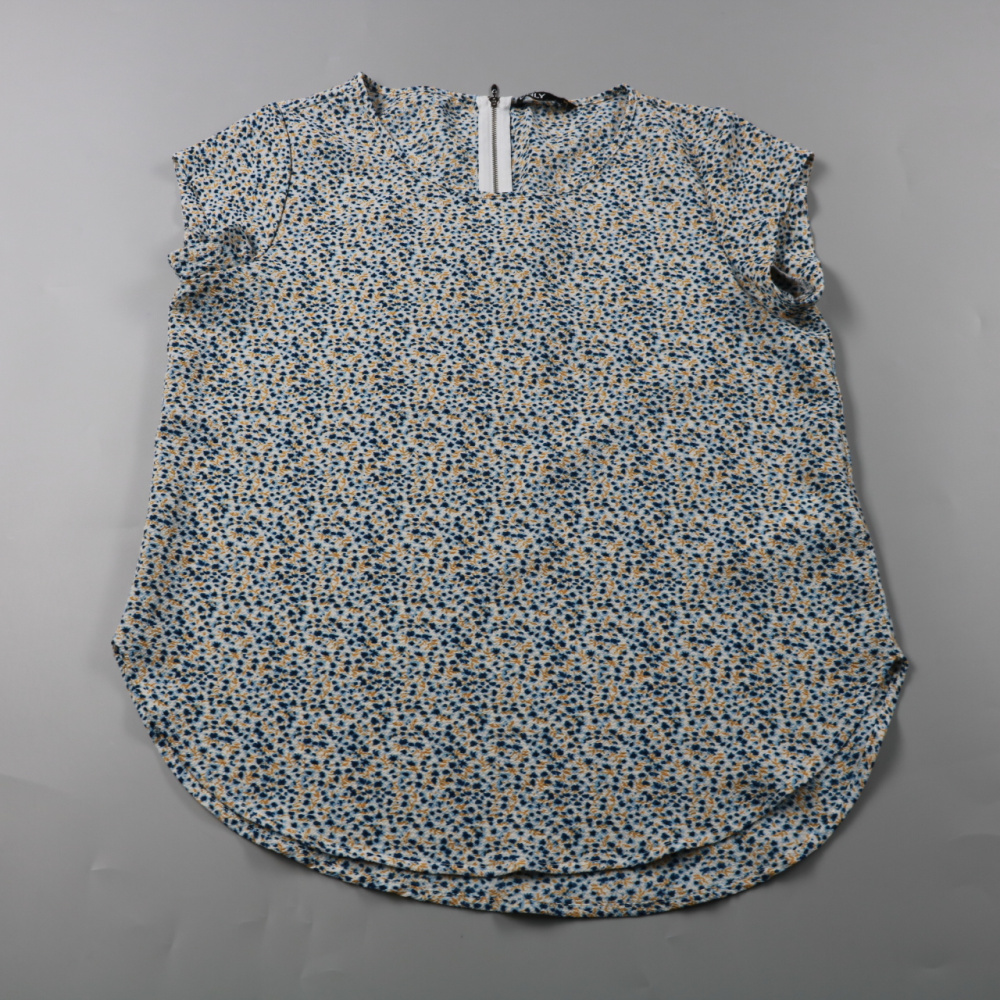 Женская блузка Only с мелким пятнистым принтом и коротким рукавом, с застёжкой-молнией у горловины. Подойдёт для лета и офиса/повседневных образов с джинсами или юбкой. Ткань лёгкая и почти не мнётся благодаря полиэстеру и эластану.