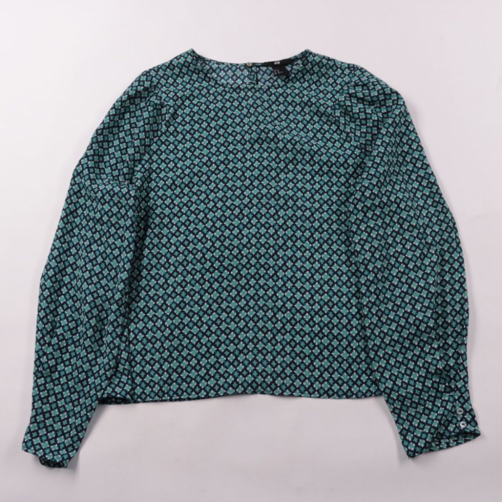 Блузка H&M из лёгкой ткани с геометрическим принтом и объёмными рукавами. Подойдёт для офиса и повседневных образов с джинсами или юбкой. Полиэстер почти не мнётся и быстро сохнет после стирки.