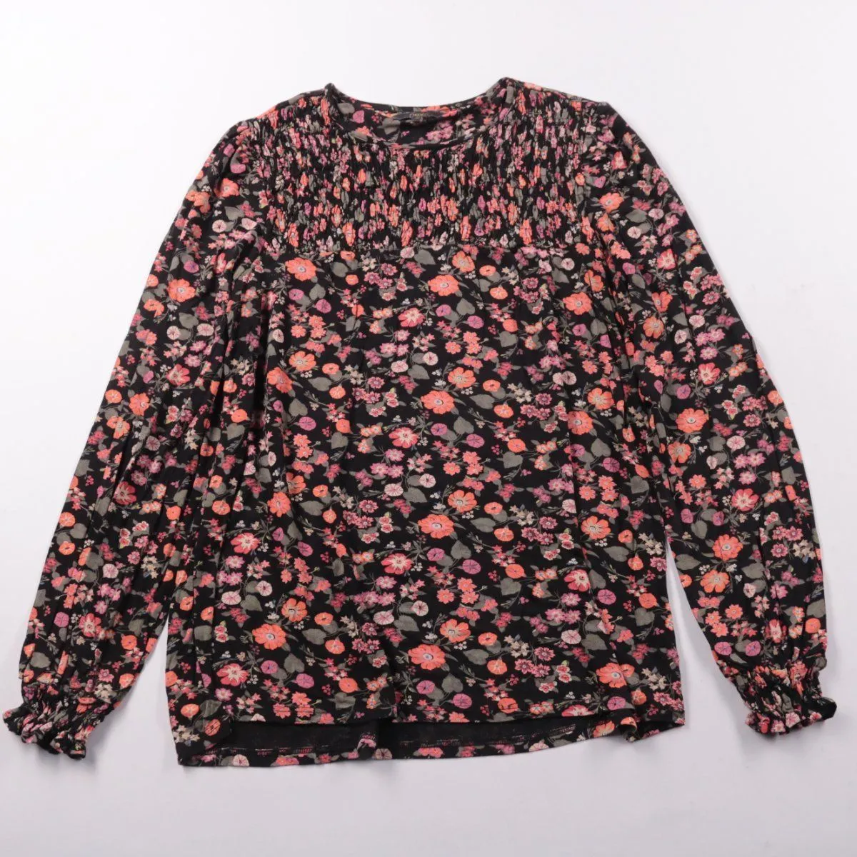 Женская блузка Next с цветочным принтом на чёрном фоне и присборенной кокеткой, рукава длинные с манжетами на резинке. Подойдёт для повседневных образов, офиса в стиле casual и прогулок в межсезонье. Вискоза в составе приятна к телу и хорошо драпируется.