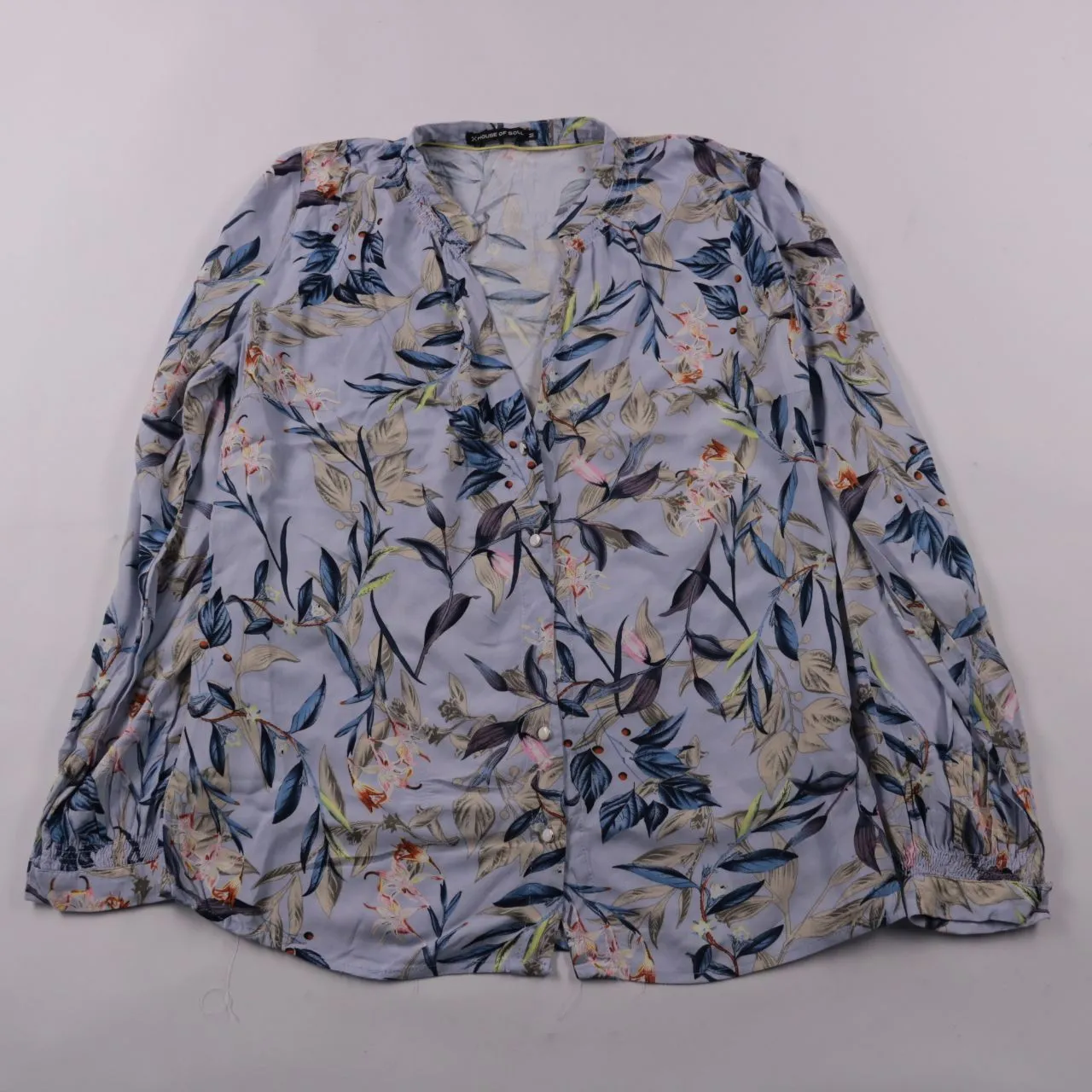 Женская блузка House of Soul из вискозы, светло-голубая с цветочным принтом и застёжкой на пуговицы. Подойдёт для офиса и повседневных образов в тёплое время или в качестве слоя в демисезон. Вискоза приятная к телу и хорошо дышит.