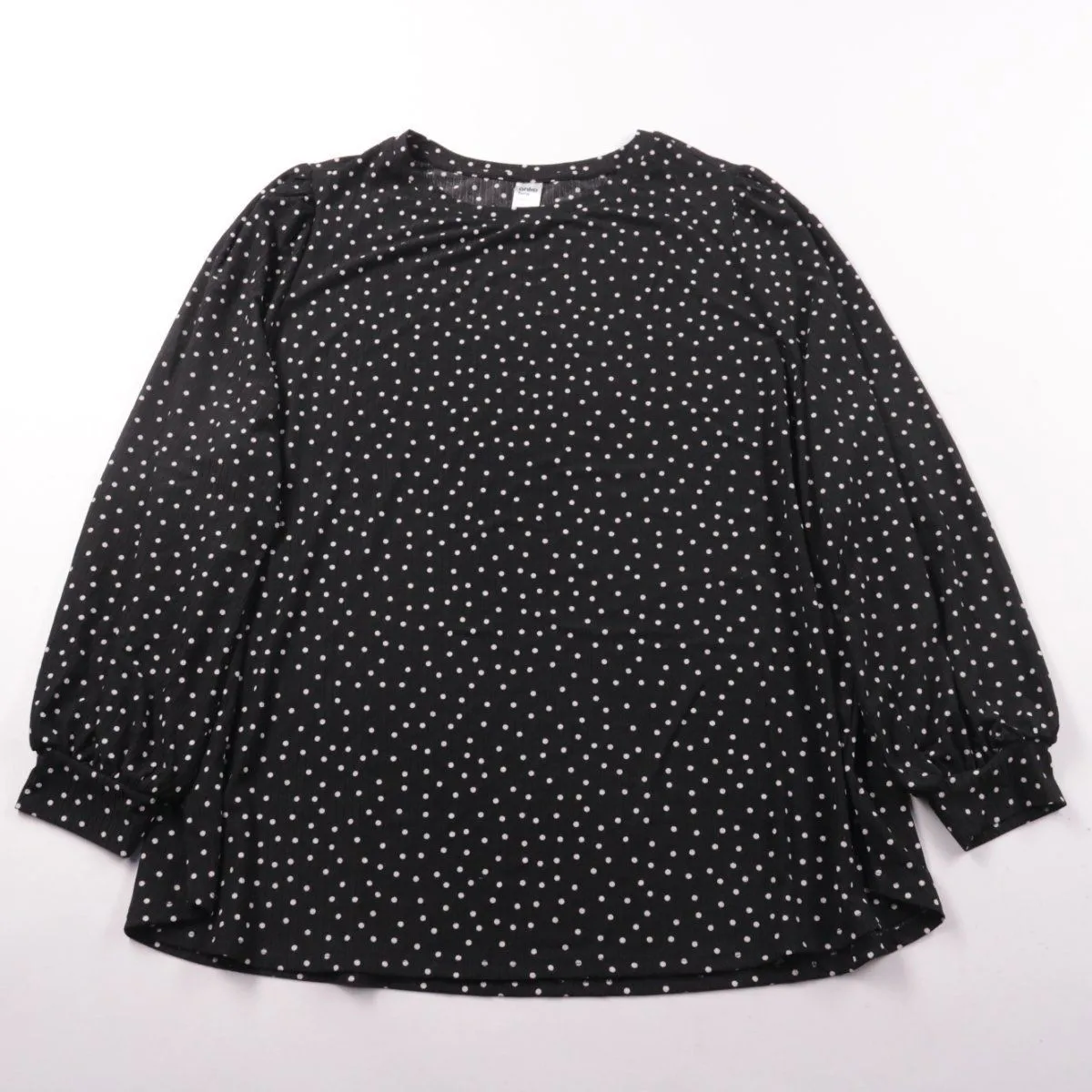 Блузка Anko Curve чёрного цвета в белый горох, с округлым вырезом и длинными рукавами на манжетах. Подойдёт для офиса и повседневных образов с джинсами или юбкой. Практичный плюс — ткань почти не мнётся и проста в уходе.