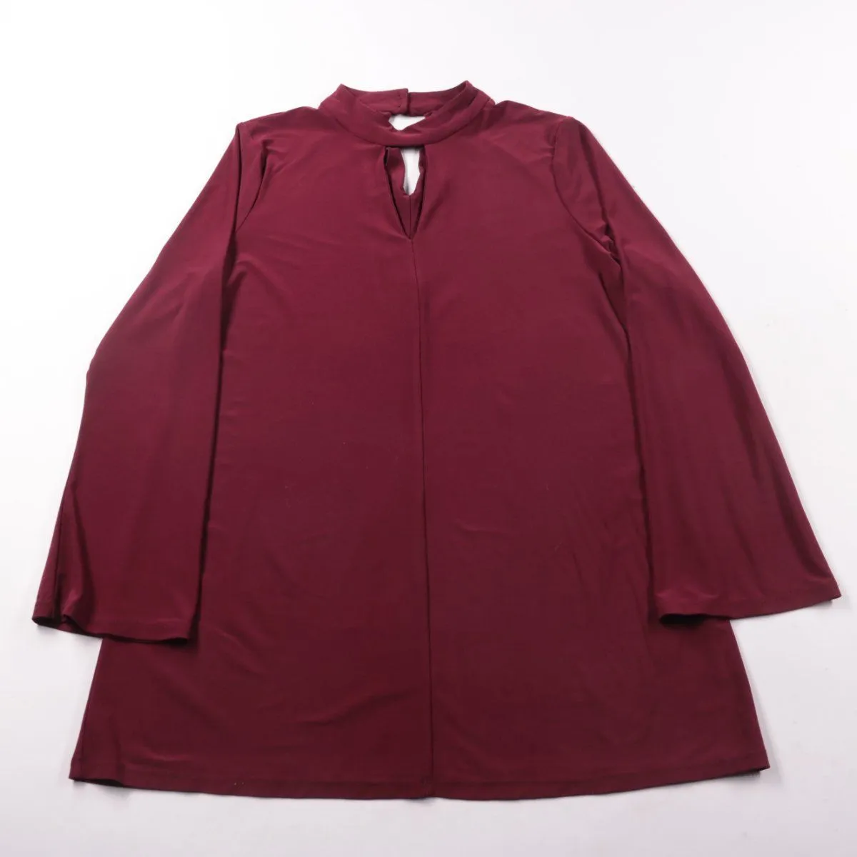 Женская блузка George бордового цвета с длинным рукавом и воротником-стойкой, с небольшим вырезом-каплей спереди. Подойдёт для офиса и для более нарядных образов с юбкой или брюками. Ткань с эластаном слегка тянется и проста в уходе.