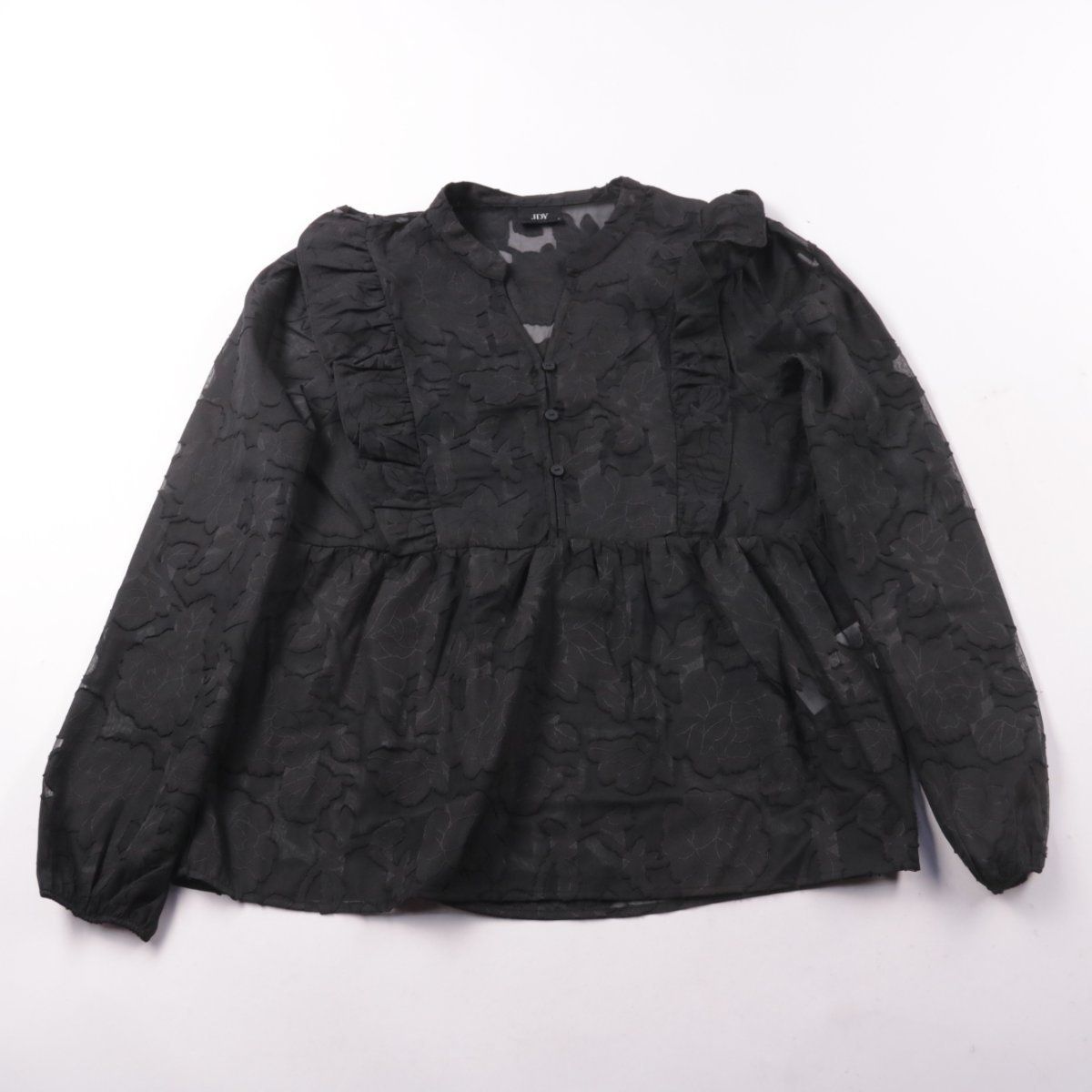 Блузка JDY чёрного цвета с фактурным жаккардовым узором и сборкой по линии талии. Подойдёт для офиса и повседневных образов, хорошо смотрится с джинсами и юбками. Материал из 100% полиэстера — легко стирается и быстро сохнет.