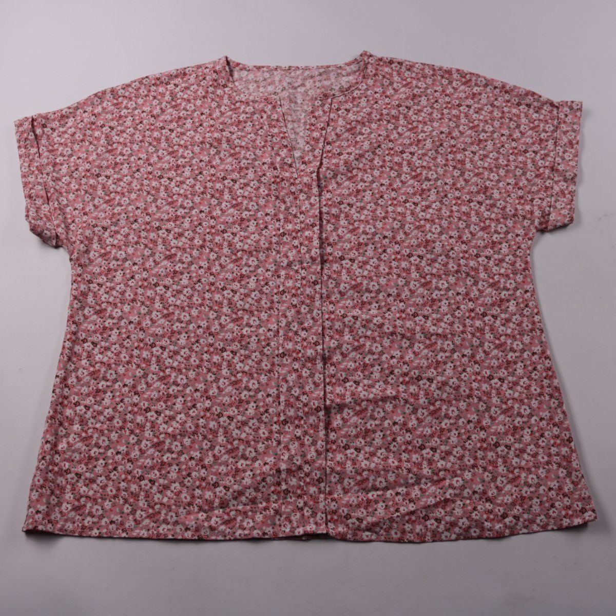 Лёгкая женская блузка с коротким рукавом и V-вырезом, выполнена в розовом цвете с мелким цветочным принтом. Подойдёт для повседневных летних образов и офиса в сочетании с брюками или юбкой. Ткань тонкая и удобная в носке, хорошо смотрится навыпуск.