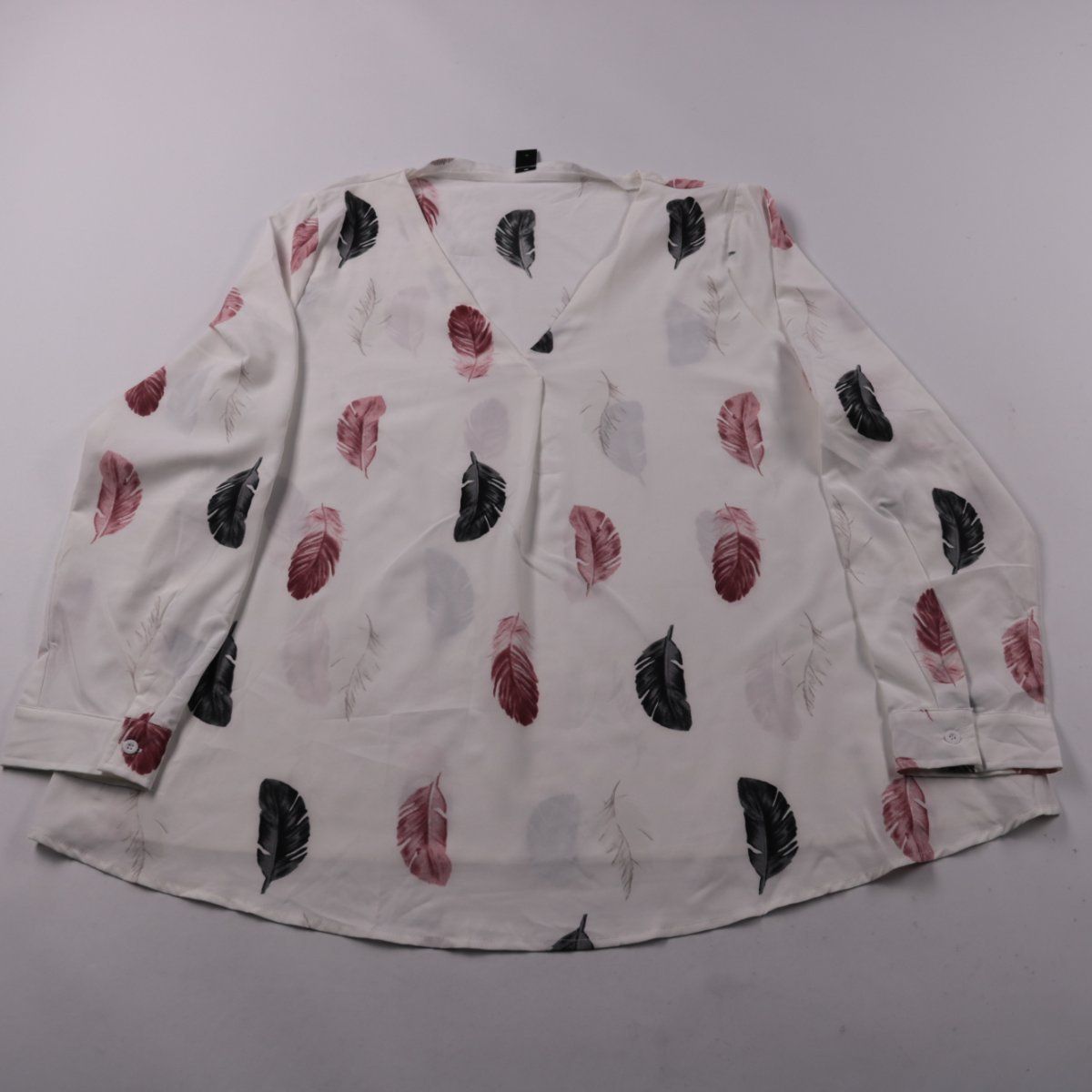 Женская блузка с V-образным вырезом и принтом в виде перьев. Подойдёт для офиса и повседневных образов с джинсами или юбкой. Ткань на основе полиэстера с добавлением эластана меньше мнётся и чуть тянется.