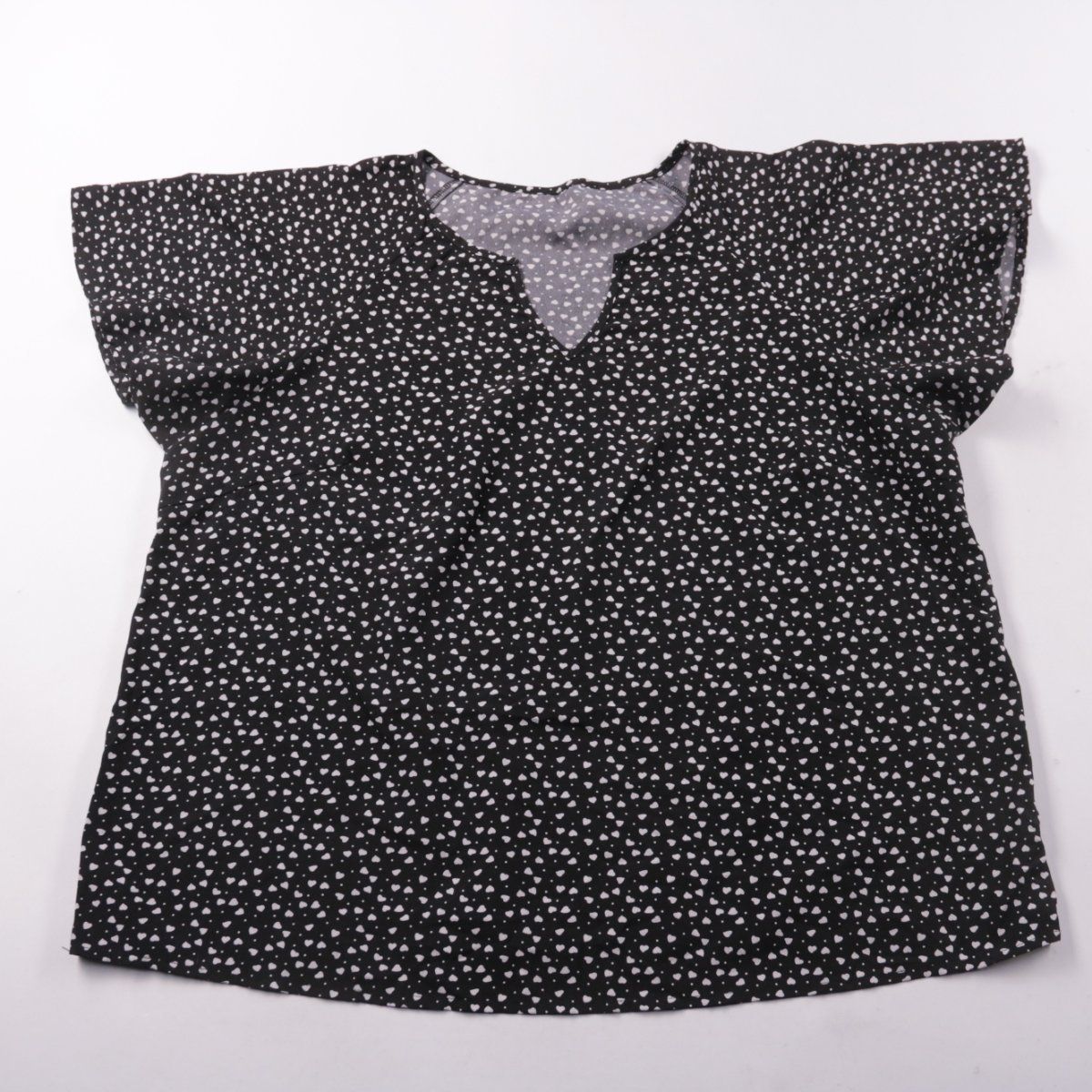 Черная блузка с мелким белым принтом и коротким рукавом, вырез с небольшим разрезом спереди. Подойдет для повседневных образов и офиса в теплую погоду. Легко сочетать с джинсами и классическими брюками.