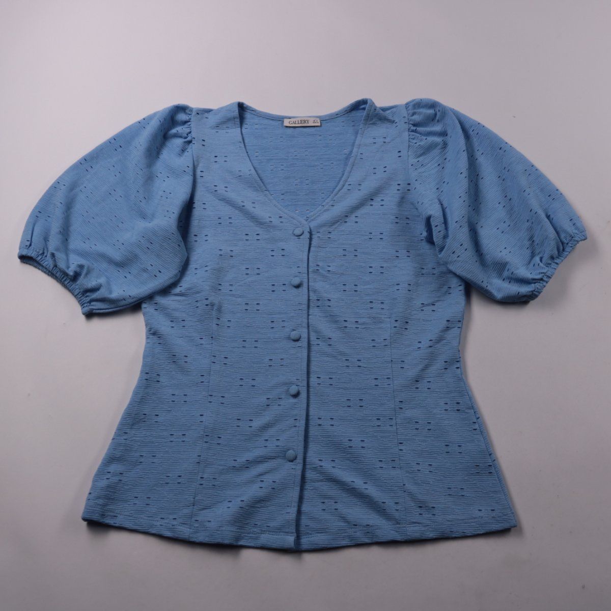 Блузка Gallery голубого цвета с короткими рукавами-фонариками и застёжкой на пуговицы. Подойдёт для повседневных образов и офиса в тёплую погоду. Ткань эластичная, поэтому комфортно садится по фигуре.