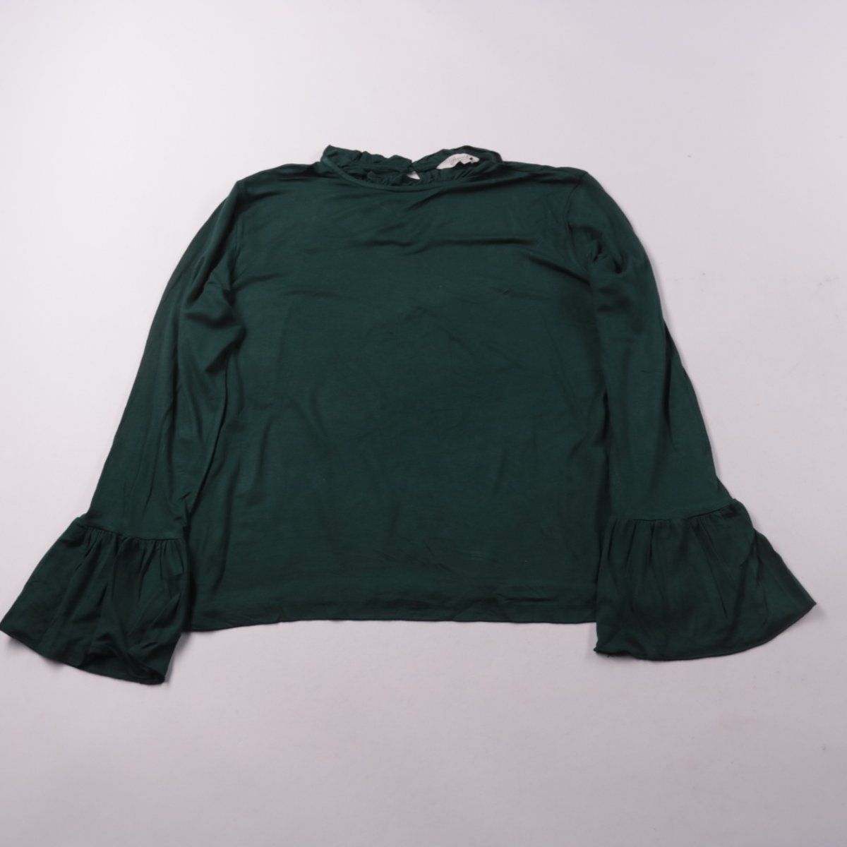 Блузка Peacocks тёмно-зелёного цвета с длинным рукавом и широкими манжетами-воланами. Подойдёт для повседневных образов и офиса, хорошо сочетается с брюками и юбками. Приятная к телу ткань с добавлением эластана даёт комфортную посадку и лёгкую растяжимость.
