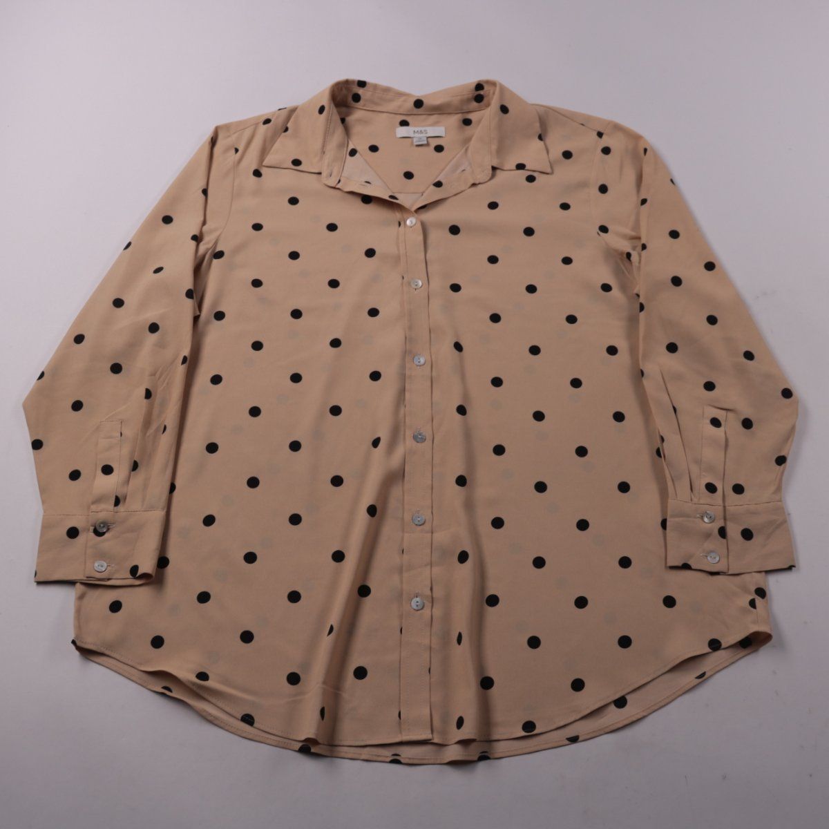 Блузка M&S бежевого цвета в чёрный горох, с отложным воротником и застёжкой на пуговицы. Подойдёт для офиса и повседневных образов, хорошо сочетается с однотонными брюками или джинсами. Лёгкий полиэстер почти не мнётся и быстро сохнет после стирки.