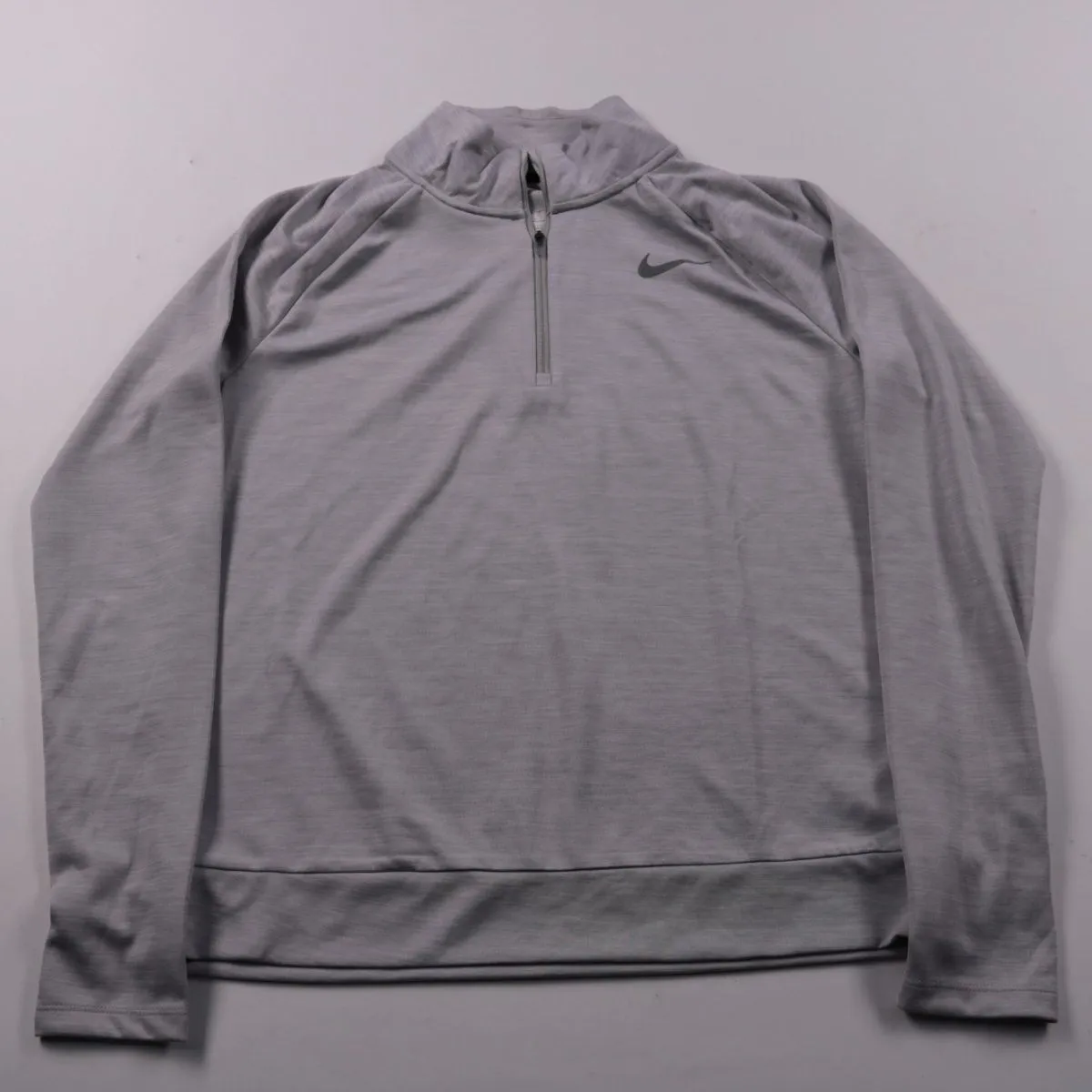 Свитшот Nike Dri-FIT серого цвета с короткой молнией у горловины и воротником-стойкой. Подойдёт для тренировок, бега и повседневной носки в прохладную погоду. Лёгкий полиэстер быстро сохнет и отводит влагу, поэтому в нём комфортно при активности.