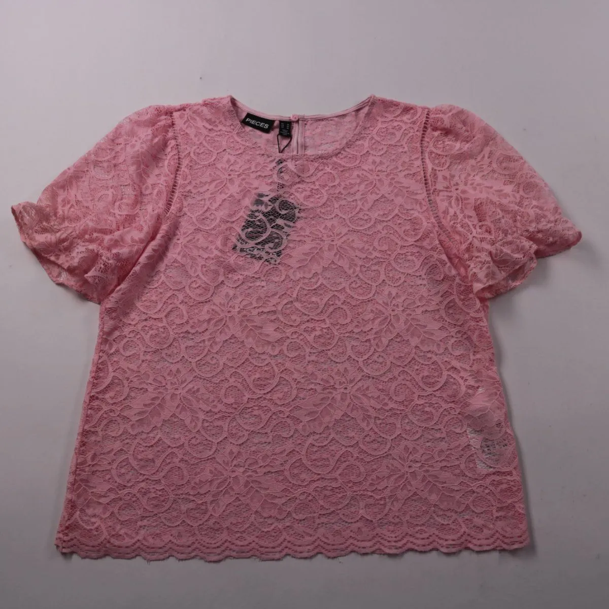 Кружевной топ Pieces в розовом оттенке Rose Shadow с коротким рукавом и фигурным (фестончатым) низом. Подойдёт для летних образов и выходов, хорошо сочетается с джинсами или юбкой. Материал тянется за счёт эластана, поэтому комфортно садится по фигуре.