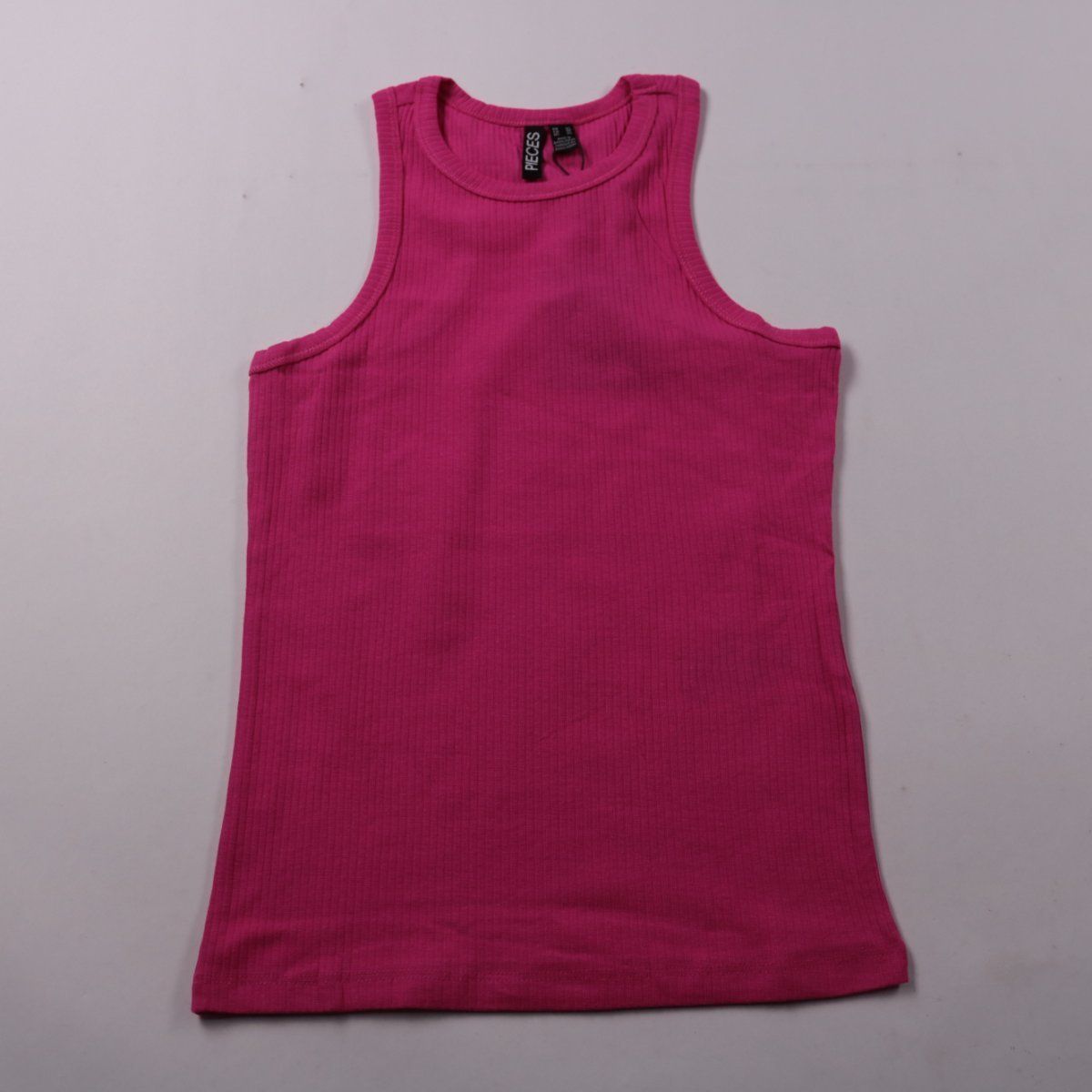Трикотажная майка Pieces в рубчик ярко-розового (фуксия) цвета, облегающий крой и круглый вырез. Подойдёт для лета и тренировок или как базовый слой под рубашку/жакет. Эластичный материал хорошо тянется и комфортно сидит по фигуре.