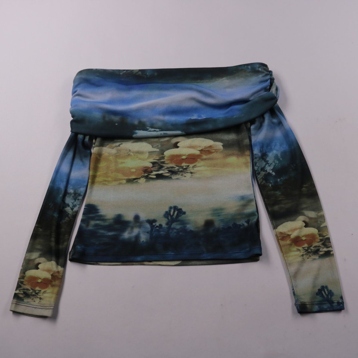 Женский лонгслив Topshop с длинными рукавами и ярким пейзажным принтом. Подойдёт для образов на выход и на каждый день с джинсами или юбкой. Лёгкий полиэстер быстро сохнет и почти не мнётся.