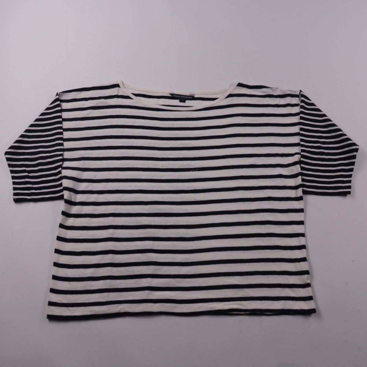 Женский лонгслив French Connection в черно-белую полоску с вырезом «лодочка» и рукавом 3/4. Подойдёт для повседневных образов и офиса с джинсами или брюками. Хлопковый трикотаж мягкий и комфортный в носке.