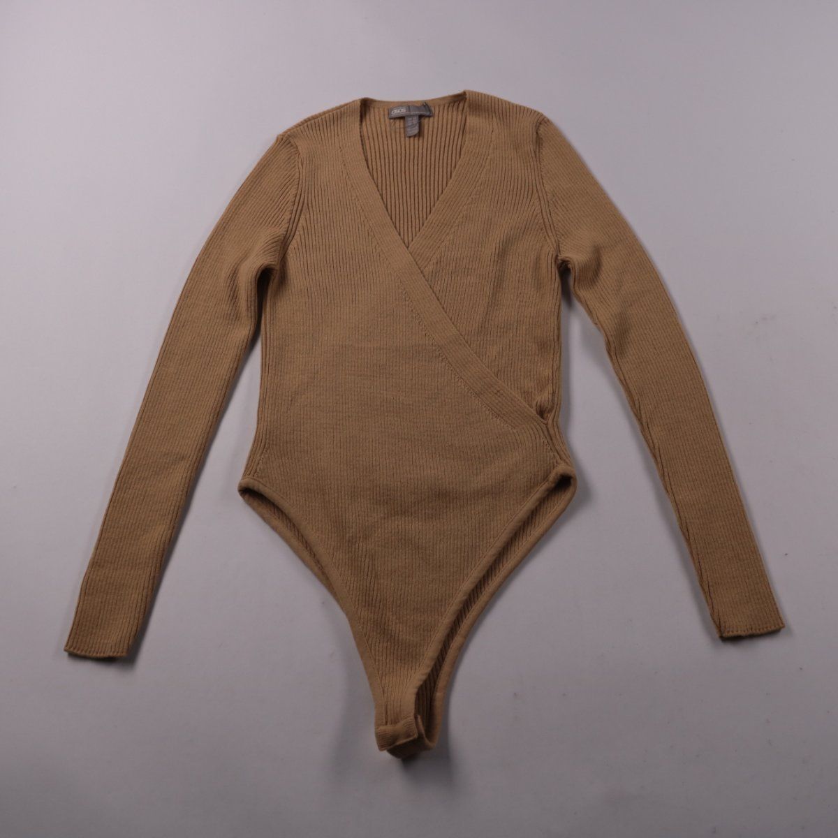 Женское боди ASOS бежевого цвета, выполнено из фактурного трикотажа в рубчик с запахом и V-образным вырезом. Подойдёт для повседневных образов в прохладную погоду, хорошо смотрится с джинсами и юбками с высокой посадкой. Эластичный материал комфортно облегает и не сковывает движения.