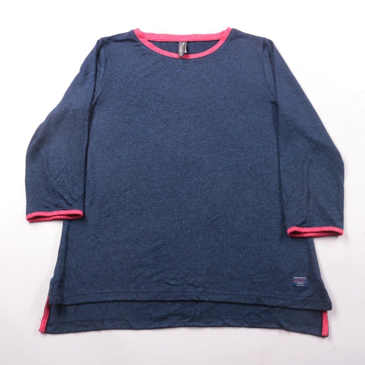 Женский лонгслив Multiblu тёмно-синего цвета с розовой окантовкой на горловине и манжетах. Подойдёт для повседневной носки и как базовый слой в прохладную погоду. Ткань с эластаном слегка тянется и комфортно садится по фигуре.