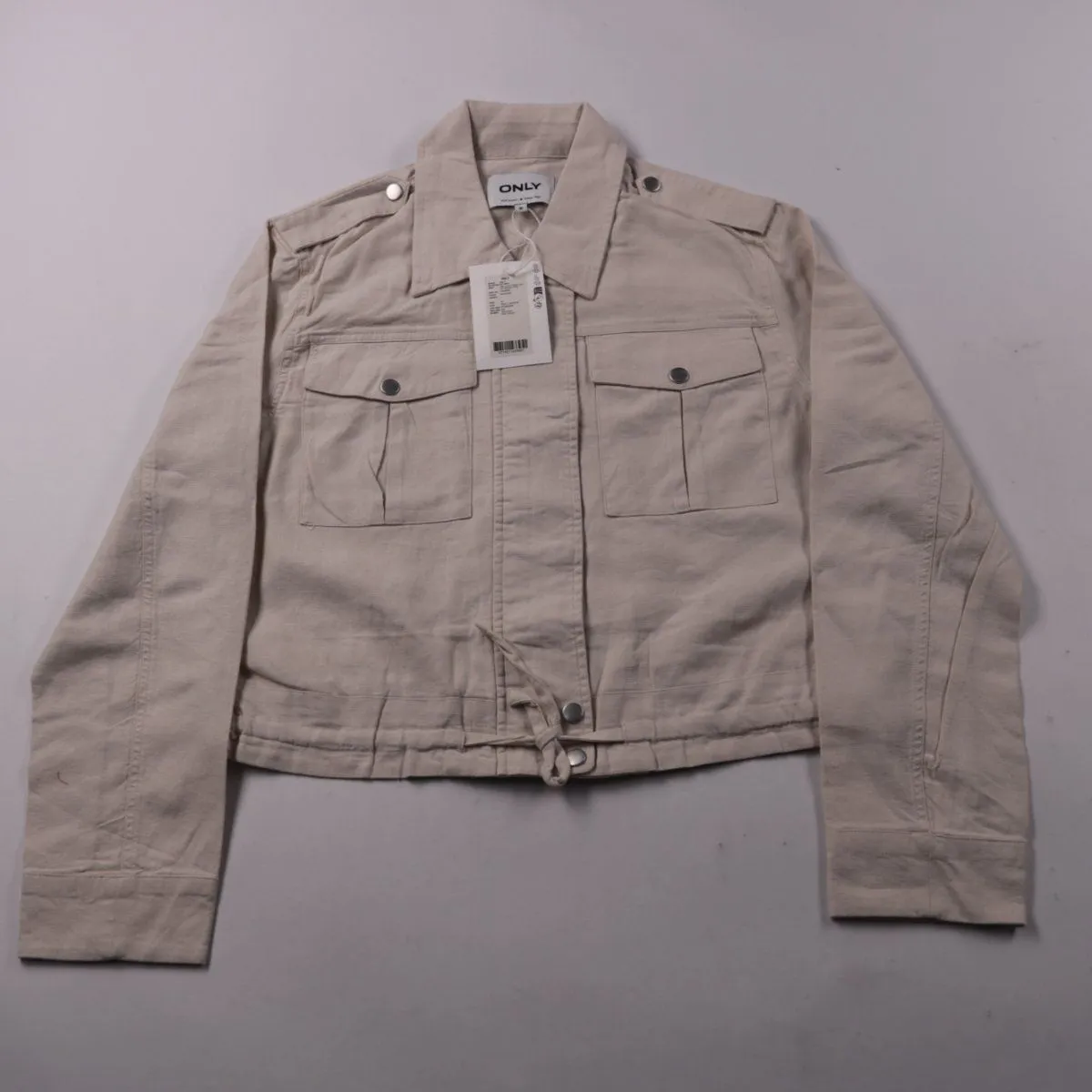 Лёгкая женская куртка ONLY в цвете Moonbeam, с отложным воротником и накладными карманами на груди. Подойдёт для тёплой весны и лета, хорошо сочетается с джинсами и платьями. Смесовый лён с вискозой даёт дышащую посадку и комфорт в носке.