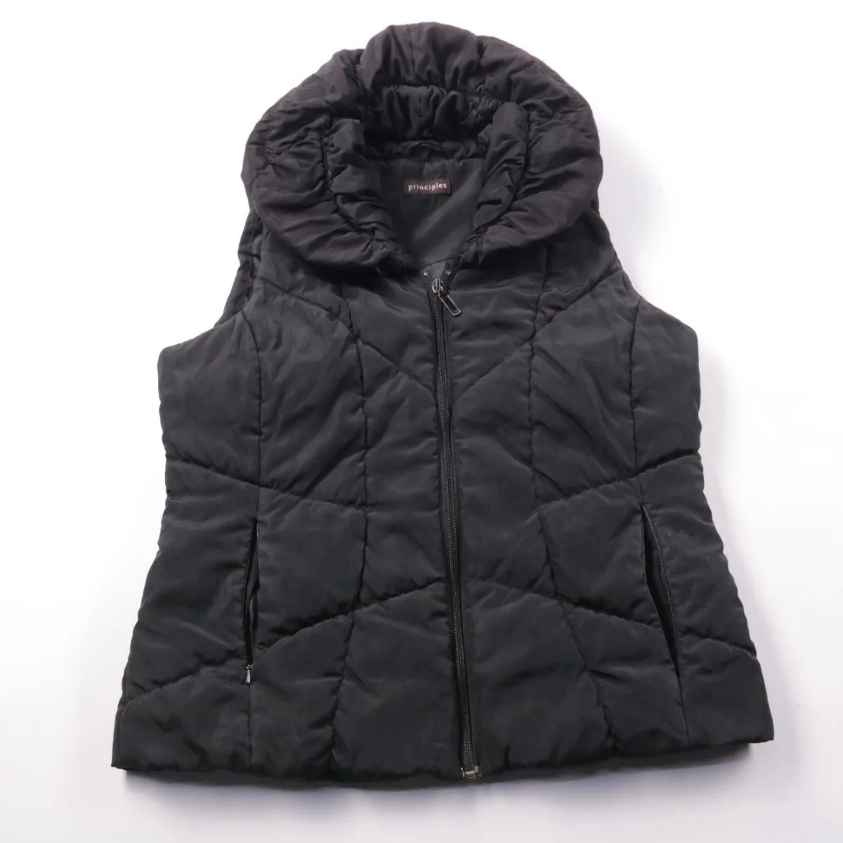 Женский стёганый жилет Principles чёрного цвета с объёмным воротником-стойкой и застёжкой на молнию. Подойдёт для прохладной погоды в демисезон, удобно носить поверх худи или свитера. Лёгкий синтетический утеплитель и два кармана на молнии делают его практичным для города и прогулок.
