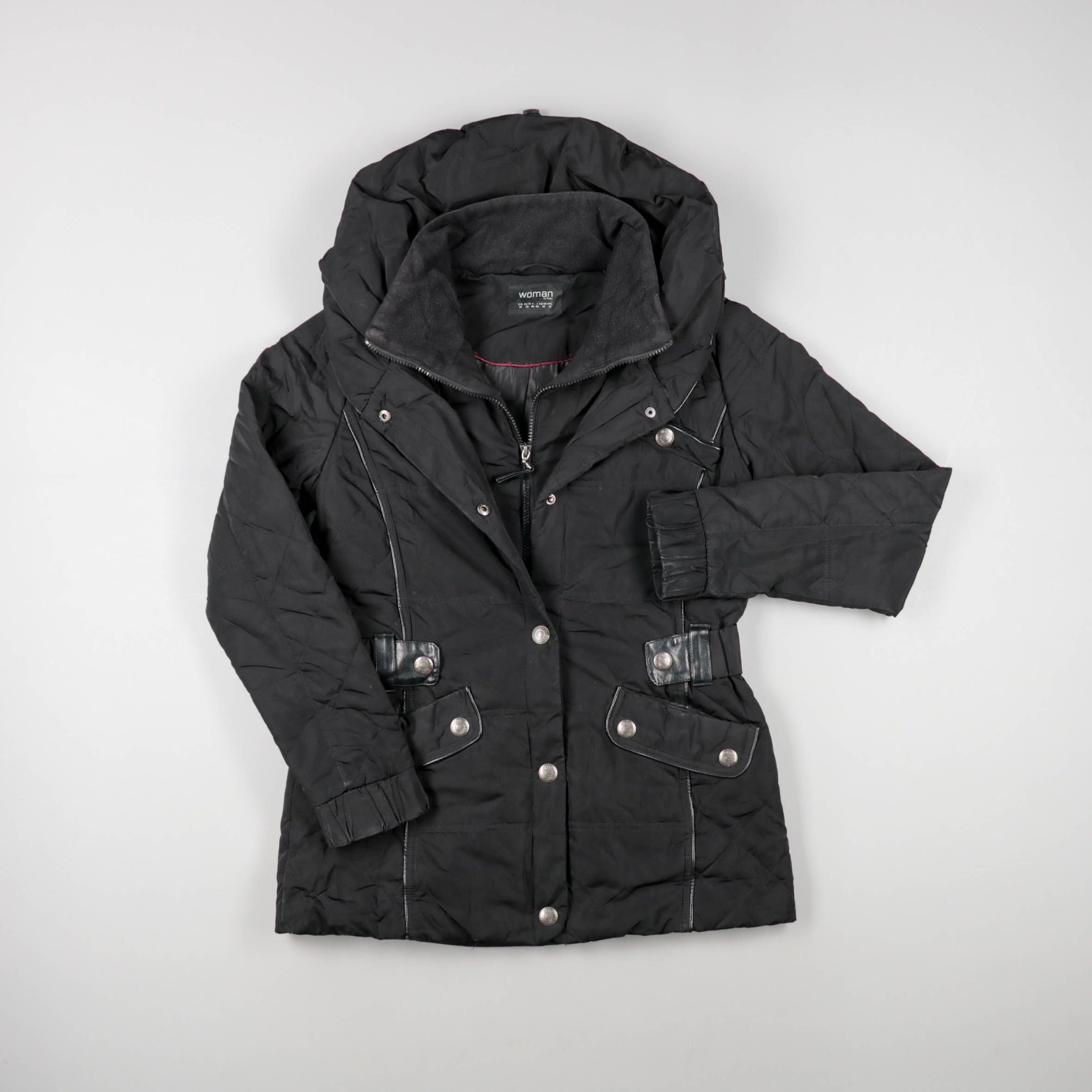 Женская зимняя стёганая куртка с объёмным капюшоном и застёжкой на молнию и кнопки, без явного бренда. Подойдёт для повседневной носки в холодную погоду, удобно сочетать с джинсами и тёплыми ботинками. Практичный плюс — глубокие карманы с клапанами и у...