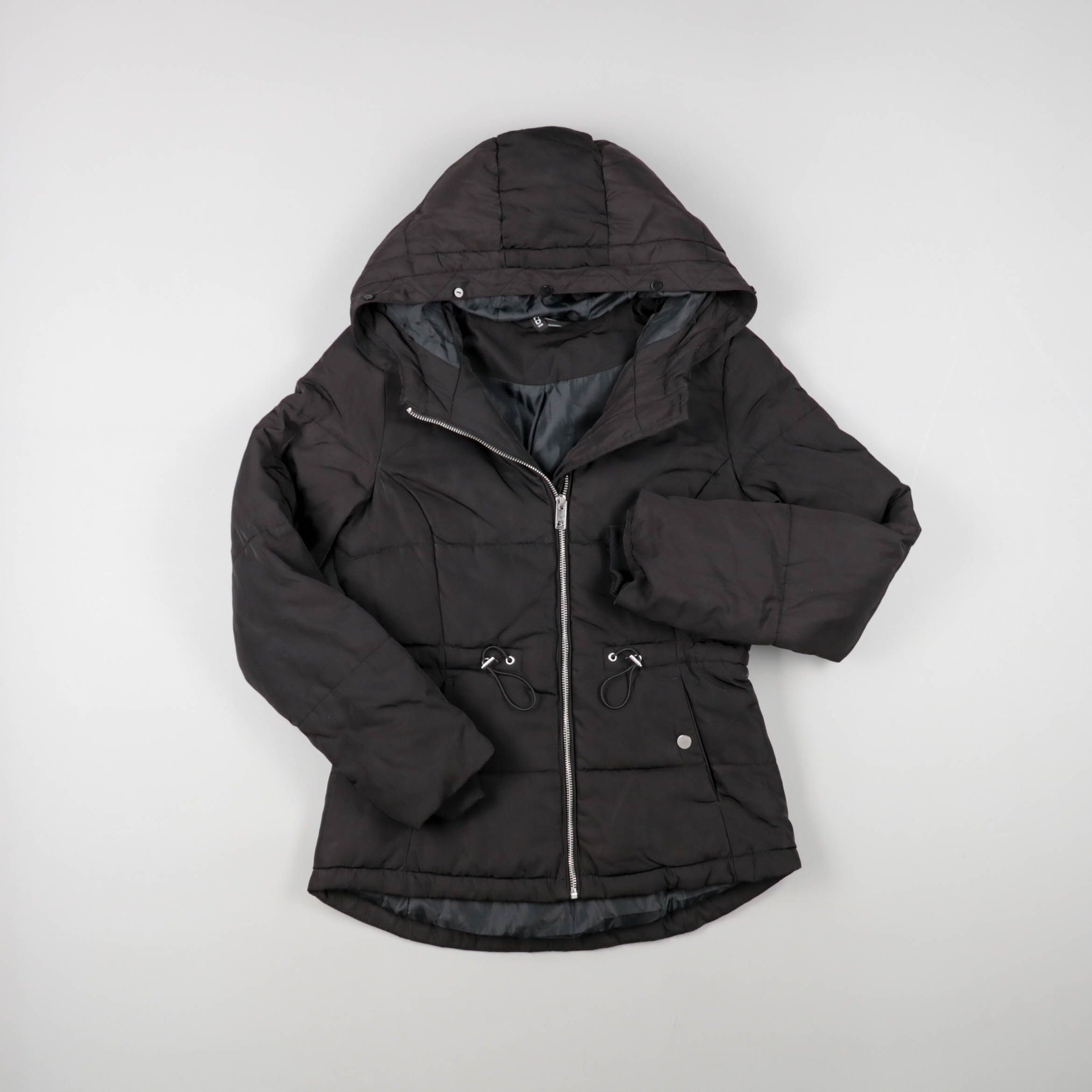 Женская стёганая зимняя куртка с капюшоном, приталивание регулируется кулиской на талии. Подойдёт для повседневной носки в холодную погоду и прогулок по городу. Практичный плюс — плотная посадка по талии и капюшон защищают от ветра.