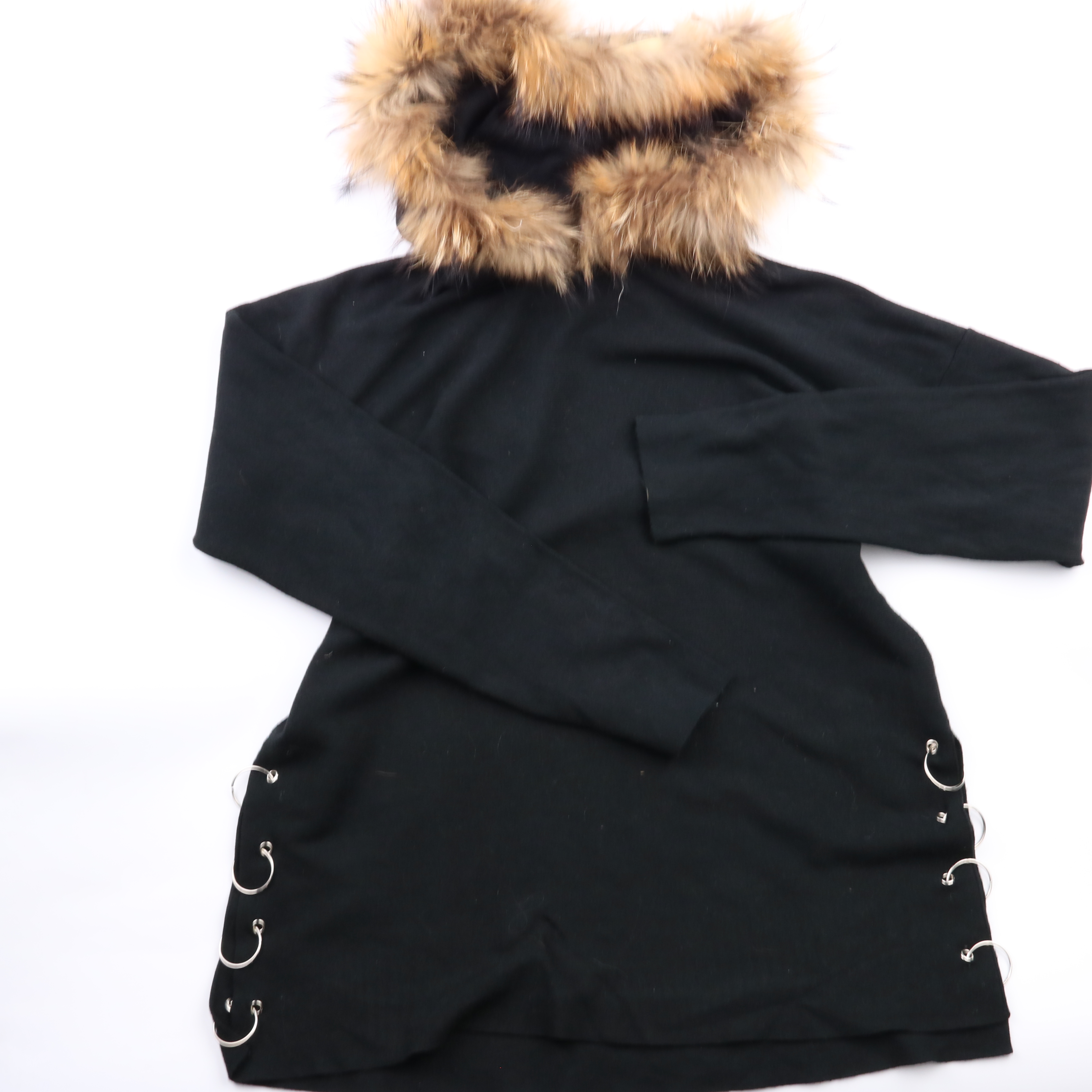 Зимняя куртка Voyelles чёрного цвета с капюшоном и отделкой под мех. Подойдёт для холодной погоды и повседневных образов, есть декоративная шнуровка с кольцами по бокам. Практичное преимущество — тёплый капюшон, который хорошо защищает от ветра.