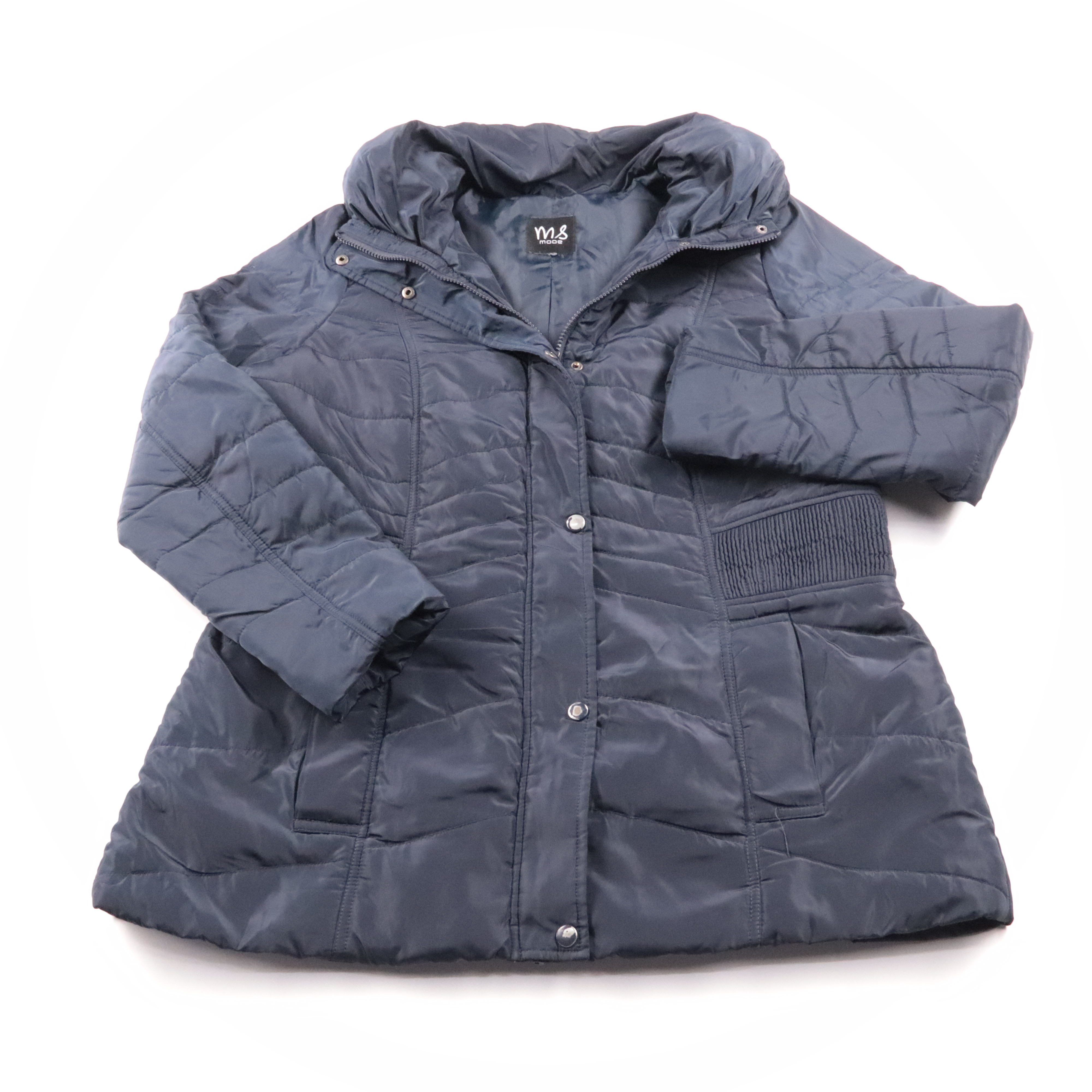 Стёганая куртка Ms Mode тёмно-синего цвета с капюшоном и удобными карманами. Подойдёт для повседневной носки в прохладную погоду, хорошо сочетается с джинсами и брюками. Практичный плюс — застёжка на молнию и кнопки помогает лучше защищать от ветра.
