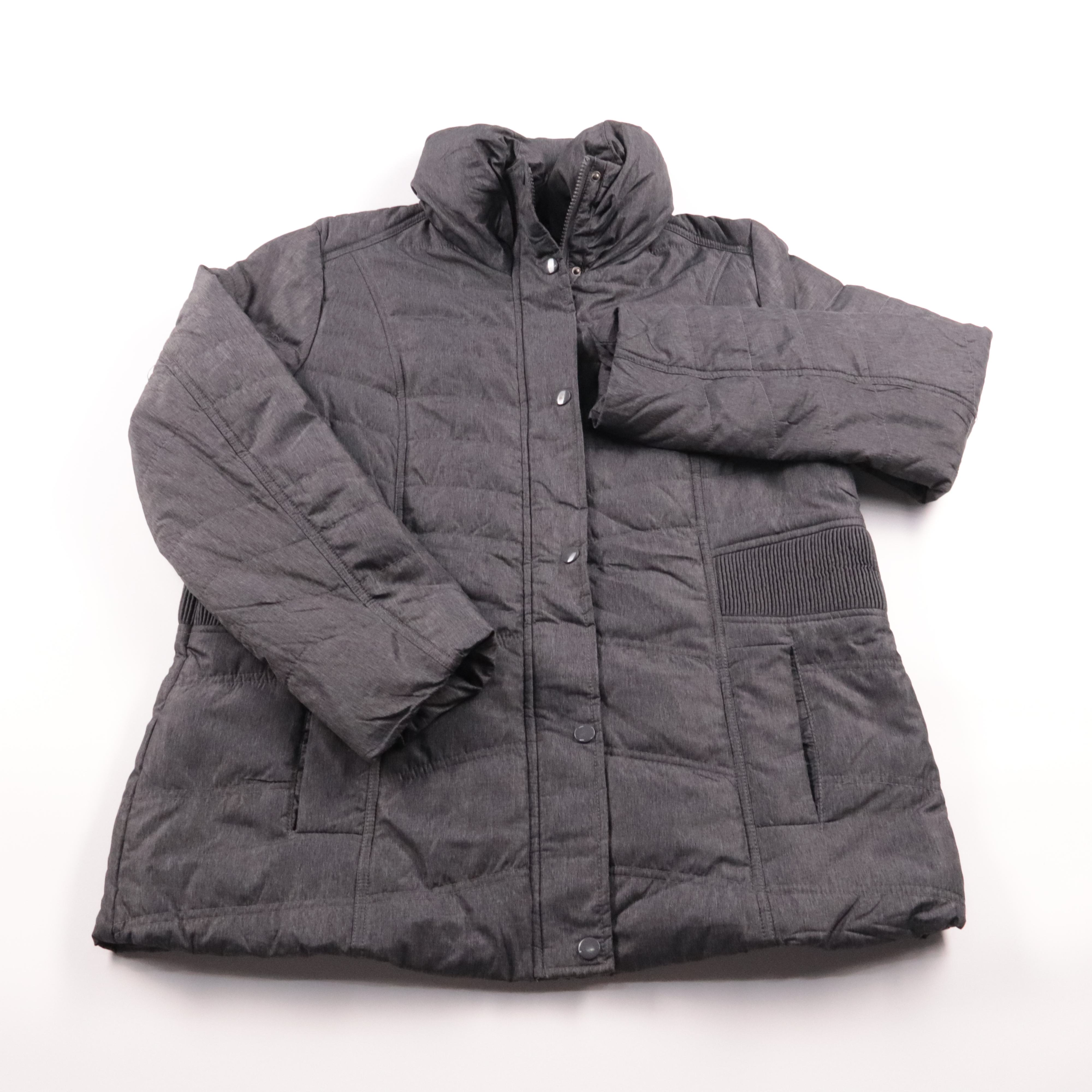 Женская утеплённая куртка Ms Mode серого цвета с высоким воротником и застёжкой на молнию/кнопки. Подойдёт для зимних прогулок и повседневной носки в городе. Практичный плюс — тёплая стёганая конструкция и удобные карманы.