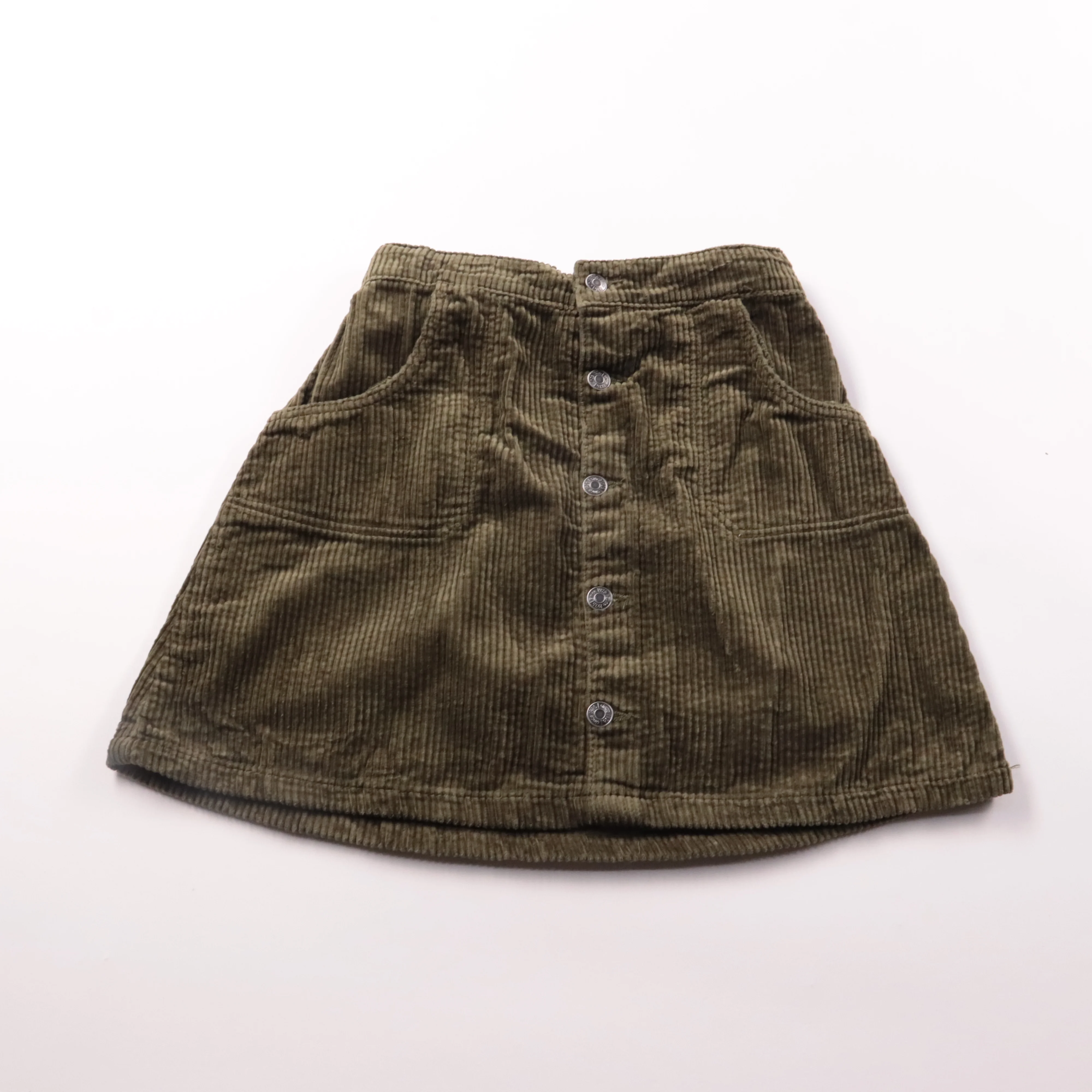 Вельветовая юбка HEMA цвета хаки с застёжкой на пуговицы и карманами. Подойдёт для прогулок и учёбы в прохладную погоду, легко сочетается с водолазками и свитерами. Плотный хлопковый вельвет хорошо держит форму и не продувается.