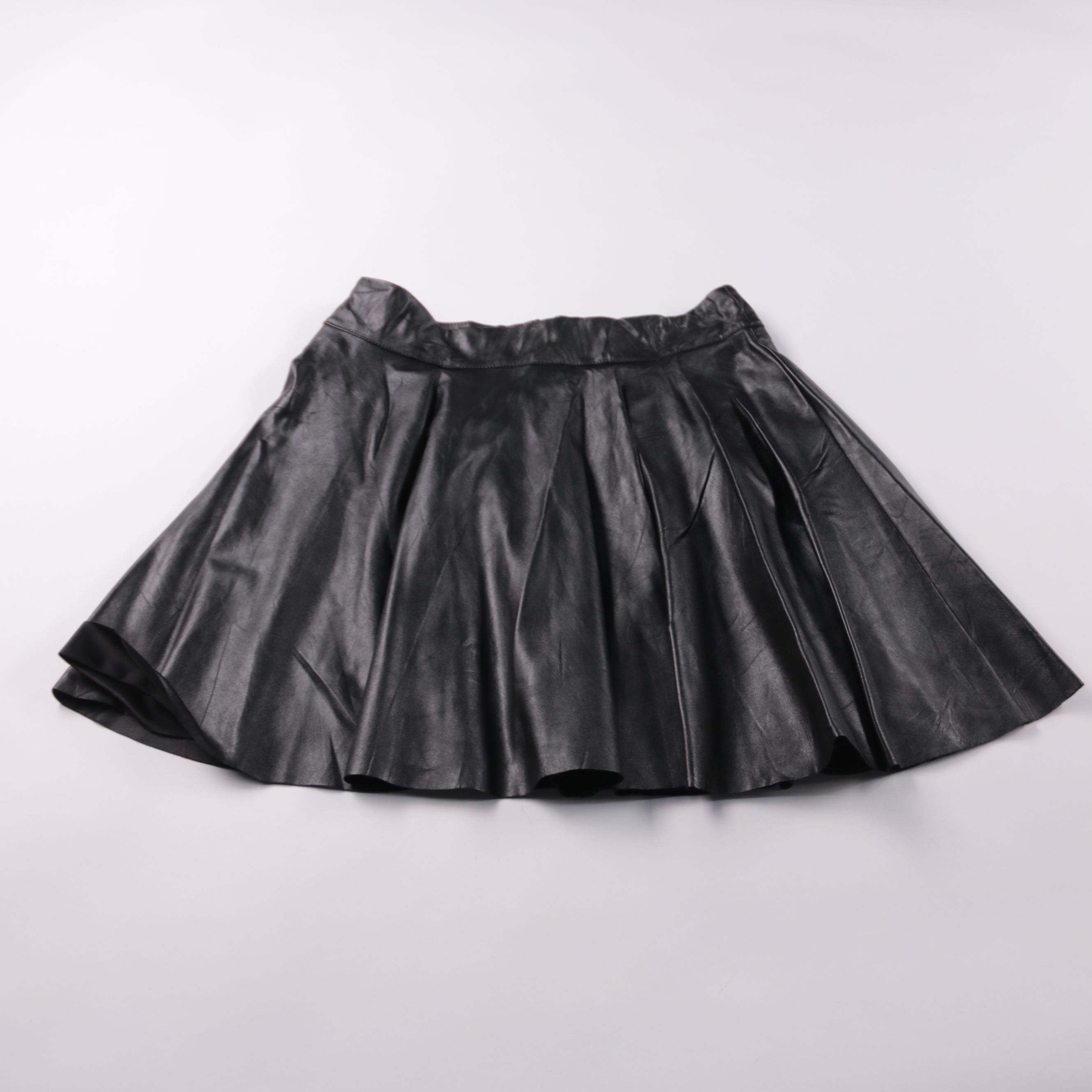 Женская чёрная юбка из искусственной кожи, расклешённая, с мягкими складками по талии. Подойдёт для повседневных образов и на выход с ботинками или туфлями. Материал легко протирается и выглядит аккуратно.