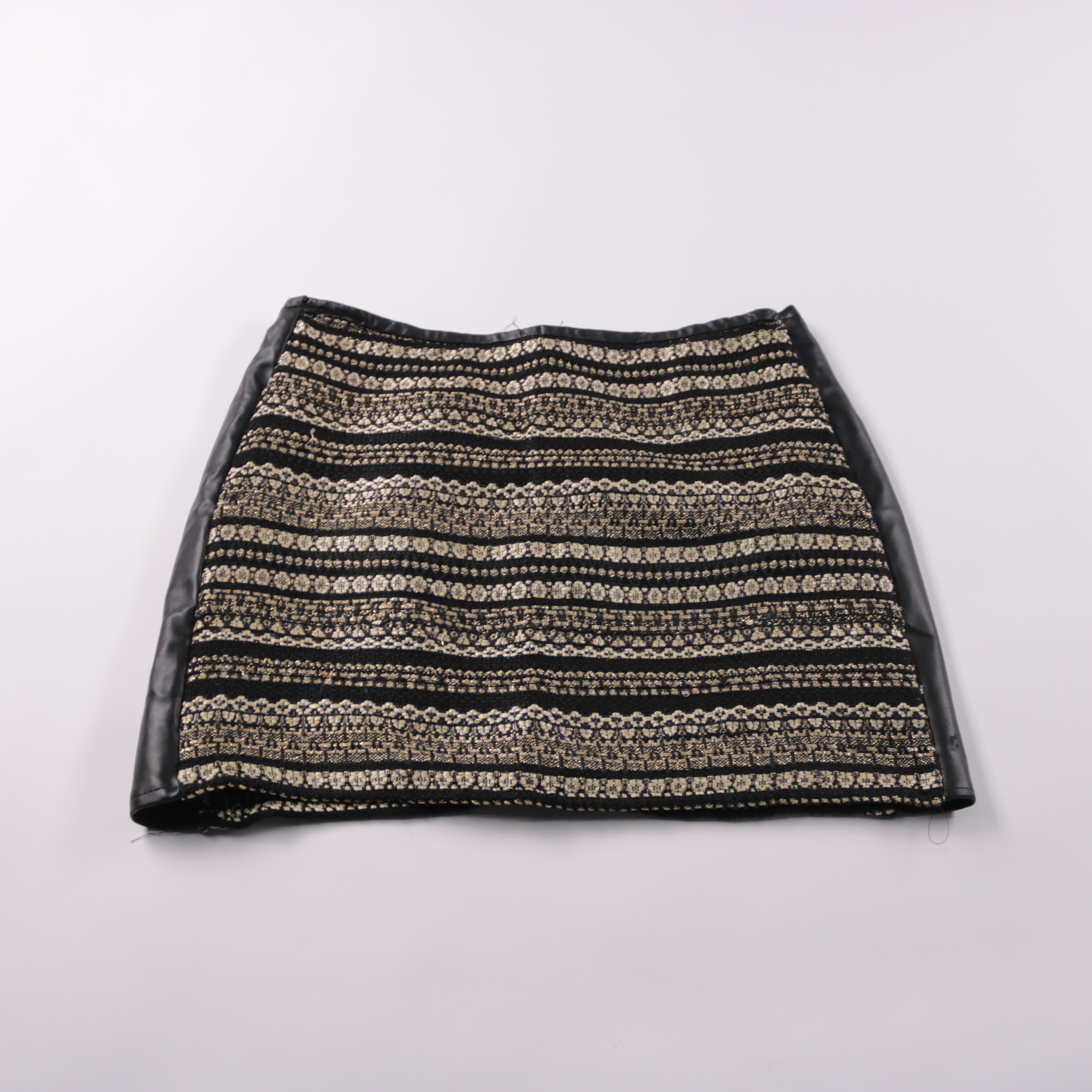 Юбка Amisu из жаккардовой ткани в черно-золотую полоску, по бокам вставки из экокожи. Подойдет для повседневных и вечерних образов с блузой или однотонным свитером. Плотный материал хорошо держит форму и выглядит нарядно.