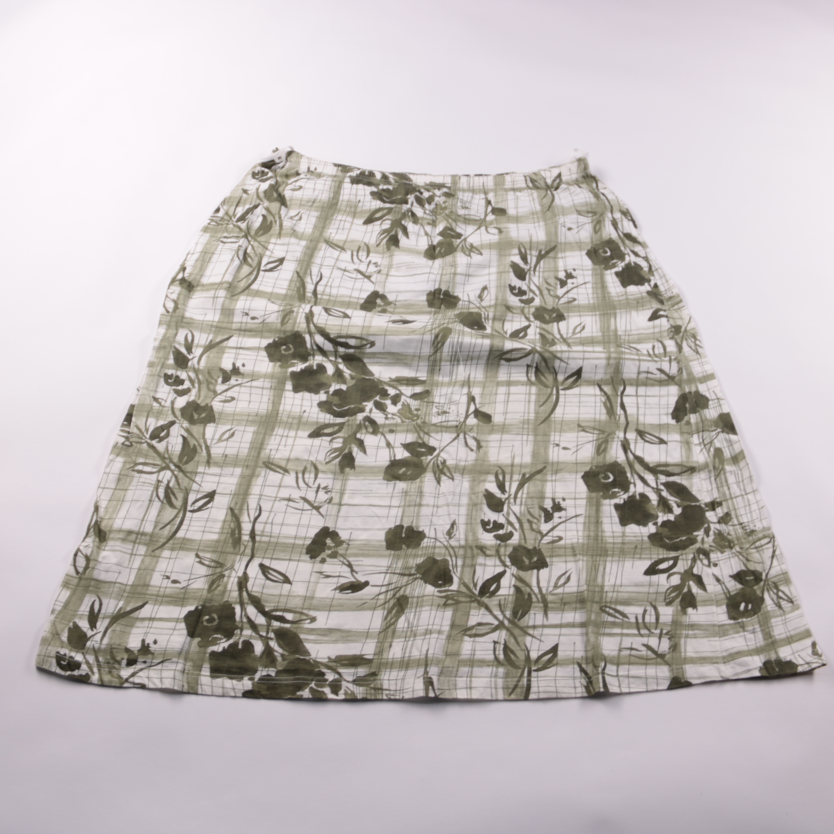 Женская юбка из хлопка с принтом в клетку и цветы в зелёно-бежевой гамме. Подойдёт для летних прогулок и повседневных образов с однотонным верхом. Натуральный хлопок хорошо дышит и комфортен в жару.