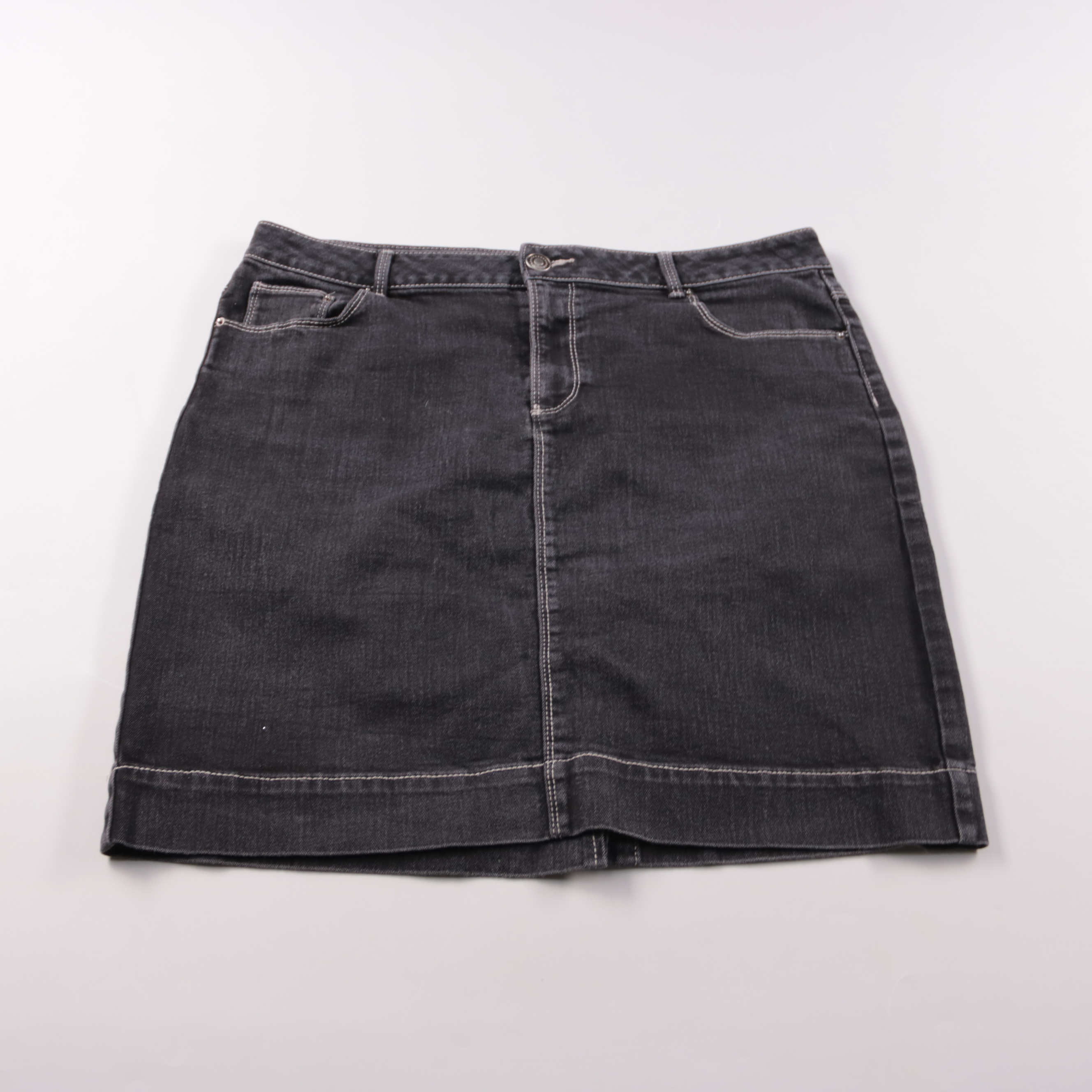 Джинсовая юбка KaWoman из денима в тёмно-сером (графитовом) цвете, прямого кроя с контрастной строчкой и карманами. Подойдёт для повседневных образов на прогулку или в офис в стиле casual, легко сочетается с футболками и свитерами. Плотный материал хор...