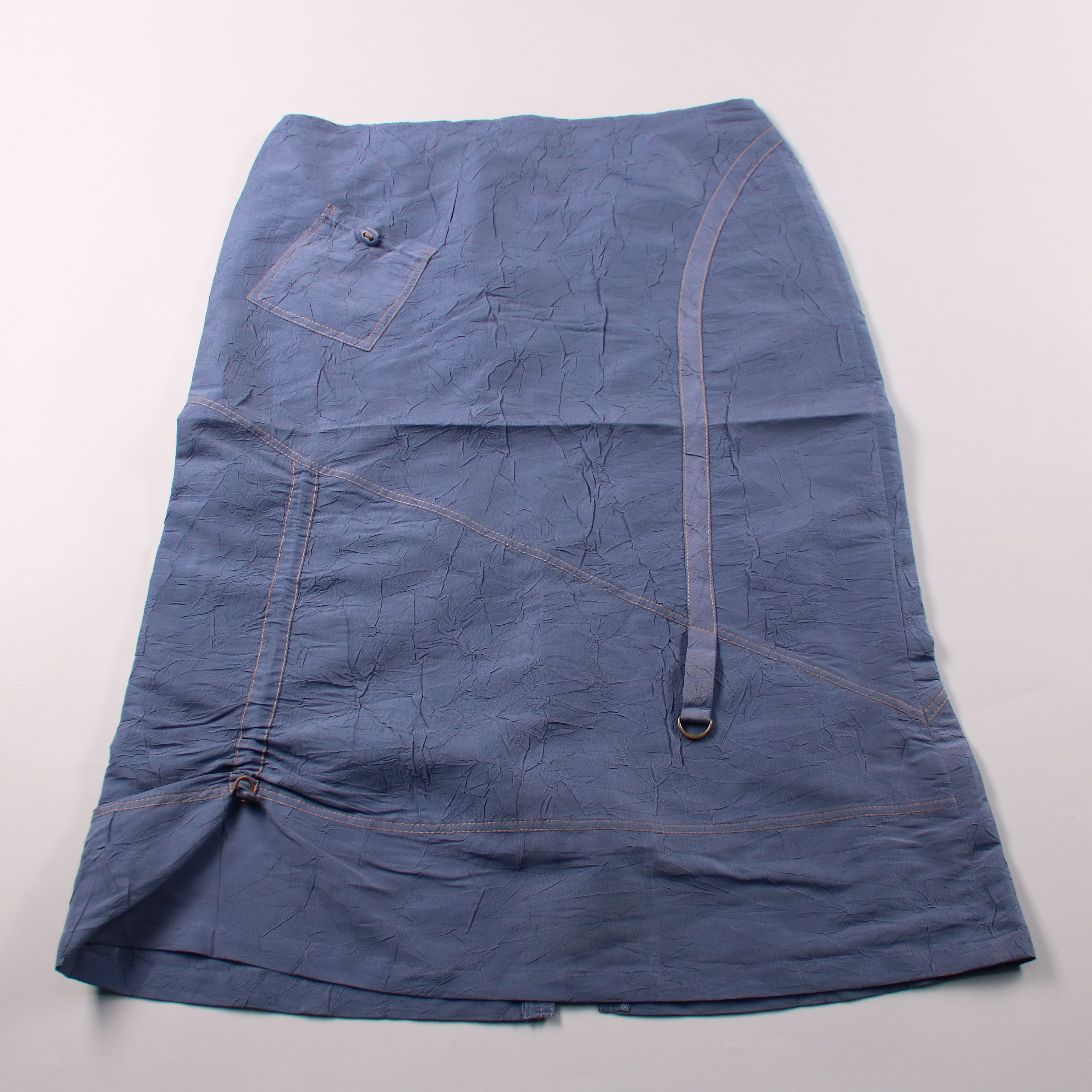 Женская юбка без указанного бренда, выполнена из лёгкой ткани синего цвета с декоративными швами, карманом и ремешком с кольцом. Подойдёт для летних прогулок и повседневных образов с топом или футболкой. Практичное преимущество — удобный крой и наличие...