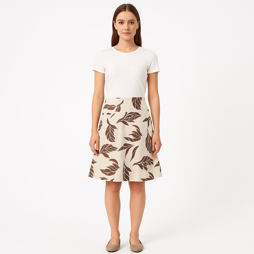 Юбка H&M из льна с подкладкой, молочного цвета с коричневым листовым принтом. Подойдёт для лета и тёплой весны, легко сочетается с однотонными футболками и рубашками. Лён хорошо дышит, а подкладка делает посадку комфортнее.