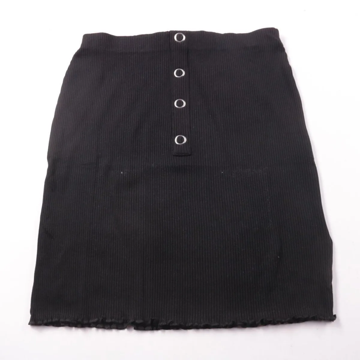 Юбка NA-KD из чёрного рубчатого трикотажа с декоративной планкой на люверсах спереди. Подойдёт для повседневных образов и на выход с топом или рубашкой. Эластичный материал хорошо садится по фигуре и не сковывает движения.